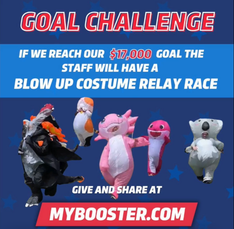 - Raise $17,000 - Ms. Moulton and a group of teachers will have a race while wearing blow-up costumes. We are almost there with about $15,000!
