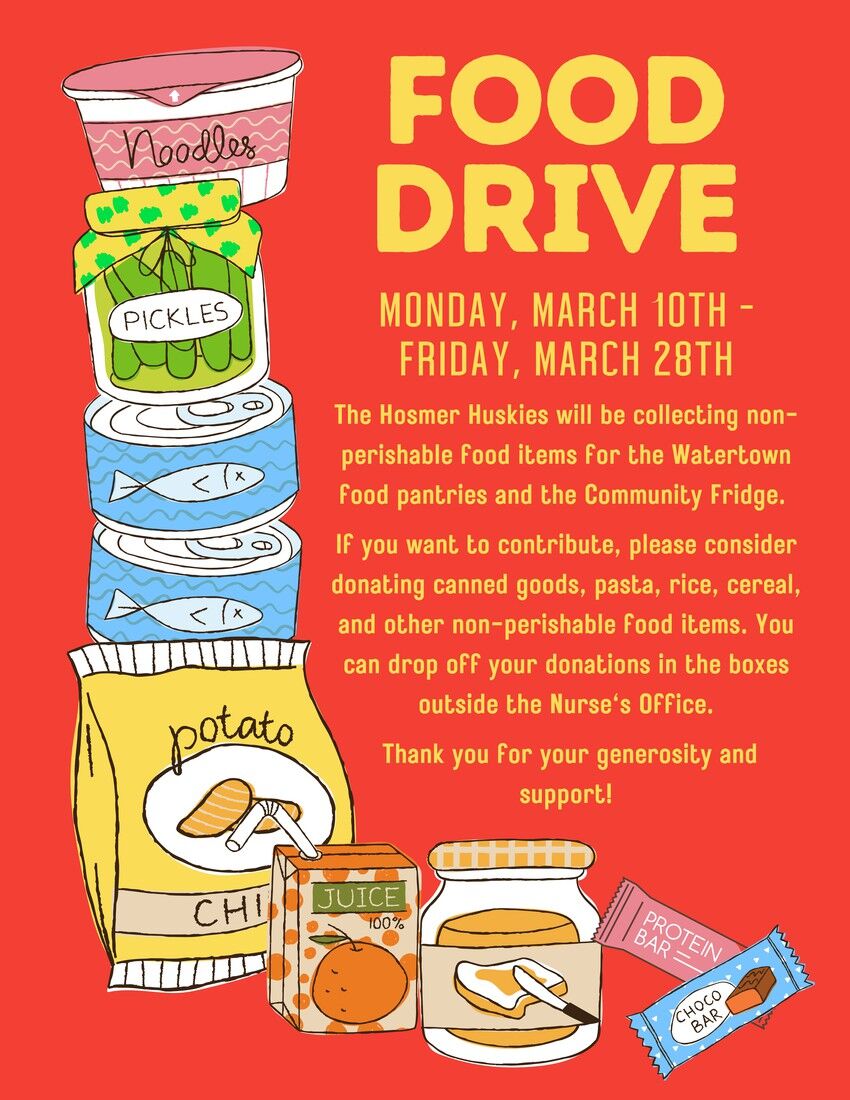 If you want to contribute, please consider donating canned goods, pasta, rice, cereal, and other non-perishable food items. You can drop your donations in the boxes outside the Nurse's Office. Scroll down to the bottom of the newsletter to find the flyer.